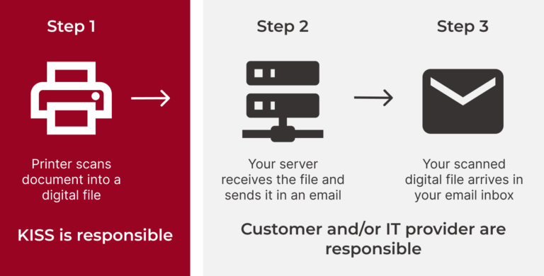 To help explain how to resolve these issues, lets first quickly understand how printing and scan-to-email works, and who is responsible for what under your service and maintenance agreement.