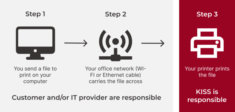 This isn’t something we do to catch anyone out – it’s simply that network and IT support falls outside the scope of your KISS service & maintenance agreement, which covers printer hardware faults. Your IT provider or internal network team is best placed to manage changes to your network, and we’d always encourage looping them in first and checking on the above possible causes.